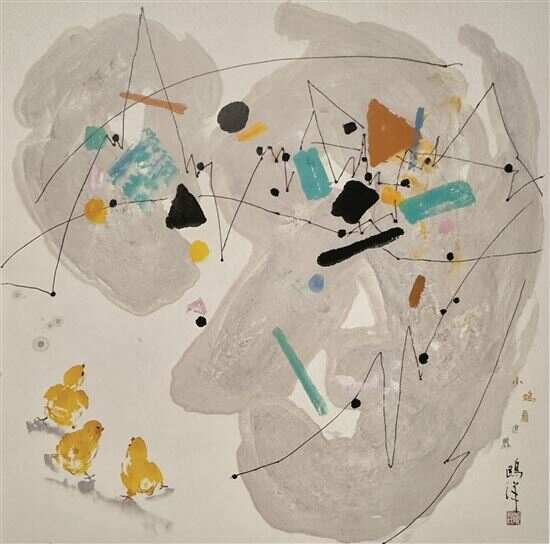 “发现国画界大致分为两类:一类基本依照传统格式作画,略有新意;另一类则是走向包括抽象图式在内的现代水墨画。在传统格式中常见画鸟、虫等,配上的是传统绘画的花草树石,现代水墨则极少出现这些传统鸟、虫。于是我便开始试着走一条中间路线,即将传统的具象小鸟、小虫等,放在抽象图式中,隐喻人们面对变幻莫测世界之茫然。”鸥洋认为,“这种走中间路线的水墨画,最大的好处是拉近了观众欣赏抽象画图式的距离。人们面对熟悉的小虫、小鸡、小鸟图形,即使对抽象领域十分陌生,估计此刻也不会去排斥,甚至还会欣然靠近。”