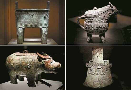 ■这是河南安阳殷墟博物馆新馆内展出的“司母辛”铜鼎(左上)、“亚长”铜觥(右上)、“亚长”牛尊(左下)、“亚长”铜钺(拼版照片,2月23日摄)。 新华社发