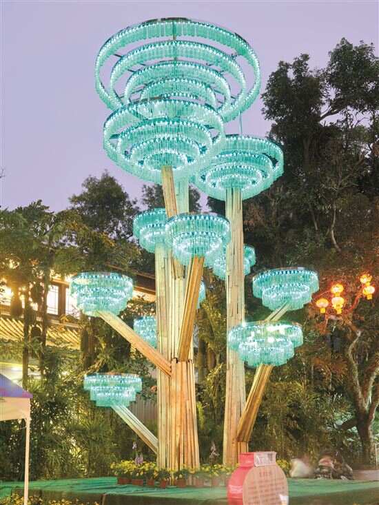 “2024年新春灯会”2月初在越秀公园亮灯,将举办至3月4日。本次灯会值得一看的包括“长达100米炫彩的彩灯巨龙”“11米高的巨型桔子树”,公园正门大型灯组《福气盈门》等,而特别的还有,采用环保材料制作,通过传导“以终为始”可循环理念,赋予回收物品新生命,生动展现山、水、树形态,绘就绿美生态画卷的《绿水青山就是金山银山》《生命之树》《节节高升》《波光粼粼》等四组作品。该系列作品作者是广州美术学院副教授、硕士生导师、博士陈鸿雁。他介绍,“《生命之树》是一座具有生命力特征的公共艺术雕塑,树干和支架由公园回收的木板构成,每个支架悬挂绿色矿泉水瓶,根深叶茂。这个生态装置象征着可持续发展的力量,它发出声音,呼吁人们保护环境,共同建设绿色未来。”他告诉记者,为践行环保用于艺术的概念,他和团队回收了数千个熟料瓶,通过巧妙的造型,重新赋予了废弃塑料瓶的生命。(梁志钦)