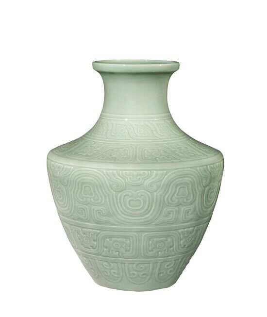 中国古董珍玩部门隆重呈献本季春拍重磅专场《寥若星辰:望星楼藏清代御窑瓷器》中的珍品佳器。清乾隆粉青釉刻仿古夔龙纹罍式大尊,器型取自周朝青铜礼器,外壁浮雕五重仿古纹饰,通体施粉青釉,沿袭宋人之赏,极尽古雅。