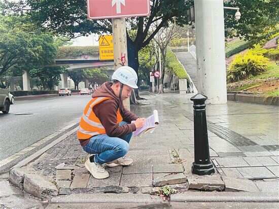 ■关国荣正在检查广园快速路人行道设施。