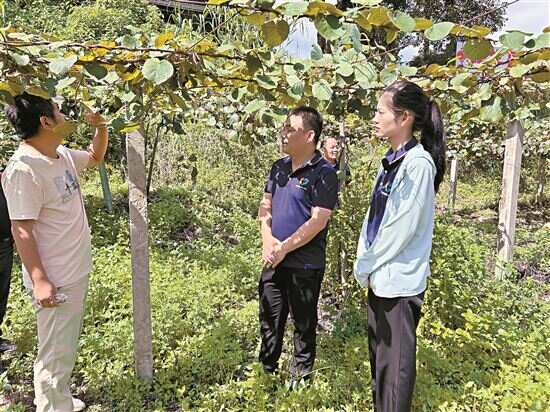 ■作为大学生志愿者,除了走村入户,孔彩日(右一)还会下到田间地头,陪同农业科技特派员查看果园。