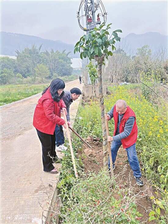 为进一步打造家在景中、人在绿中的绿美乡村景象,欧阳春霞协助村委深入推进“一名党员一棵树,一个支部一片林”绿美行动,围绕村旁、路旁、水旁等零星荒地和危房拆除后种上风景树。活动中,欧阳春霞联系社会力量参与上坣村绿美建设,一位社会爱心人士捐赠250株红叶石楠。
