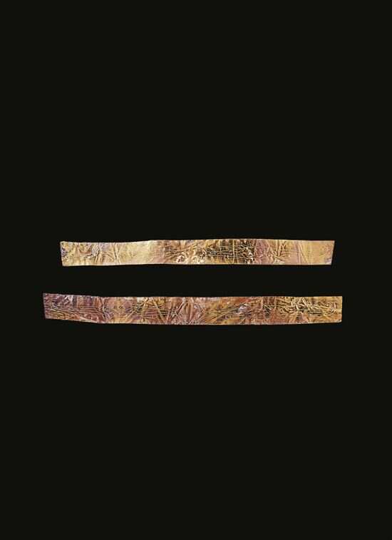 鱼纹金带,商代晚期至西周(约公元前1300-前771年),2001年四川省成都市青羊区金沙遗址祭祀区出土,成都金沙遗址博物馆藏。鱼的形象凶猛、形状奇特,与刻画在其他金器上的鱼形象不同。金带不能单独使用,应贴附于某件器物之上。金沙遗址出土的金器达200余件,数量与种类是同时期中国发现之最,彰显了古蜀国崇尚黄金的传统,更是古蜀王权与宗教思想的载体。粤博供图