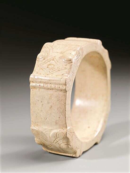 这枚玉镯高2.65厘米,直径8.2厘米,孔径6.1厘米。它整体作宽扁的环状,内壁平直光滑,外壁琢刻出4个凸面,其上刻有龙首纹。龙首纹下部是龙首的扁宽嘴,露出平直的上唇和大而方整的上排牙齿,上唇两侧有圆形凸起的鼻孔。再往上就是一对大而圆凸的眼球,外饰圆形眼圈,两眼上方还有一对短角。这枚龙首纹玉镯是在浙江省杭州市余杭区瑶山遗址中出土的。