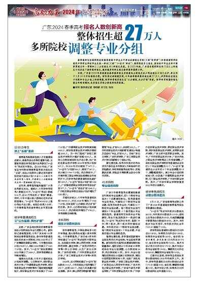 值得注意的是,多所高校因新增专业招生和优化专业结构,专业组有所调整。新快报《阳光高考》志愿填报顾问杨锐鑫表示,据初步统计今年共有45所院校存在专业分组调整,公办院校有34所,民办院校有11所。其中,专业分组增加的院校比分组减少的院校多,增加分组明显的院校有11所,包括广东机电职业技术学院、广东轻工职业技术学院、广东茂名幼儿师范专科学校、广东水利电力职业技术学院、广东省外语艺术职业学院、广州科技职业技术大学、广州涉外经济职业技术学院、罗定职业技术学院、深圳信息职业技术学院、东莞职业技术学院、广东云浮中医药职业学院。其中,广州科技职业技术大学、广东水利电力职业技术学院等近三年持续调整,广东机电职业技术学院学考普通类由去年仅2个专业组调整为12个,“3+证书”普通类也从去年的3个专业组调整为13个,调整幅度颇大。减少专业分组的院校有3所,分别是广州番禺职业技术学院、江门职业技术学院、广州东华职业学院。其中,广州东华职业学院恢复到2022年的分组模式。