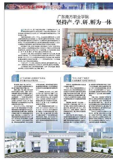 集群、创新、开放、选择、协同,是学校的专业建设大思路。紧跟广东省乃至粤港澳大湾区经济发展需求,紧抓工业机器人应用技术、人工智能等行业产业发展趋势……广东南方职业学院不断调整和优化专业结构,形成了以“工业机器人应用技术”为龙头,多个重点智能制造产业和高端服务业专业并驾齐驱的特色学科优势。