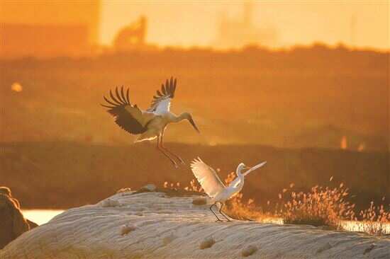 ■东方白鹳(左)与其它候鸟嬉戏。陈杰/摄