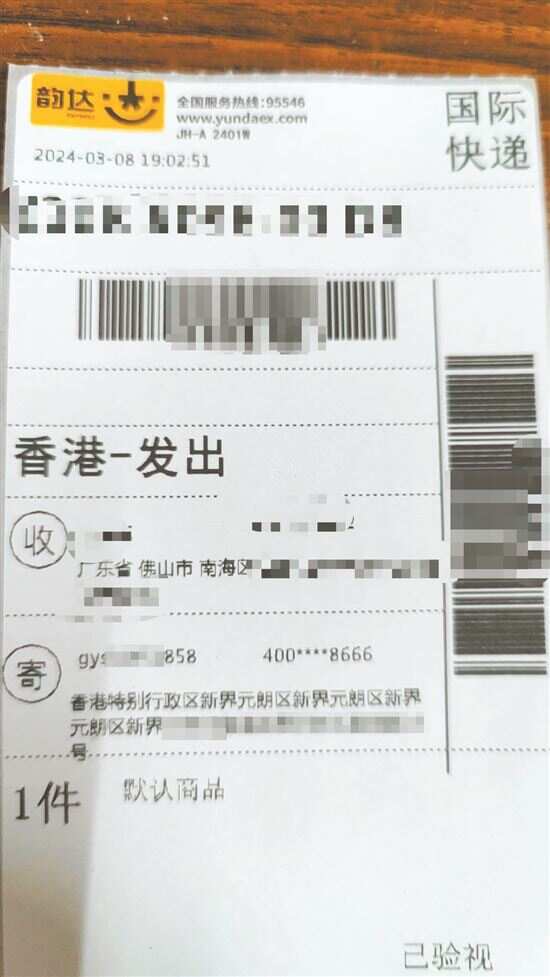 经过阿展的操作,3月13日,快递在深圳市被韵达跨境物流公司揽收,经过一番周转,于3月14日到达佛山的收货地址。记者在佛山收到快递后发现,包裹左上角是韵达的标志,右上角写明了“国际快递”,快递单号与阿展伪造的“异地上线”单号一致。至此,这个从广州转运到深圳,再寄往佛山的快递包裹,已经在韵达快递的数据库里,完成了从香港揽件—深圳口岸清关—抵达佛山收货地址的虚假物流路径。