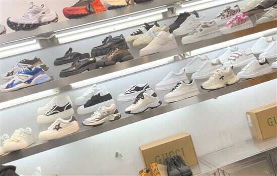 在站西路一带谋生人,很多人是一身“国际大牌”,连推货车的大叔都穿上了“名牌鞋”。3月初,记者来到金宝服装城的一、二层,这里的档口就犹如一个“小专柜”,市面上的名牌运动鞋应有尽有,“麦昆”“GUCCI”“LV”“耐克”“阿迪达斯”等“名牌鞋”随处可见,它们被整整齐齐地陈列在墙上的鞋柜。在这里,用几百元就能买到在专卖店几千上万元的鞋子。