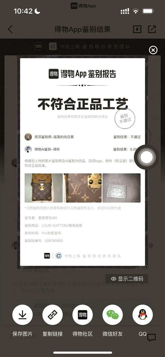 记者购买的一款高仿包,鉴定结果显示为“不符合正品工艺”