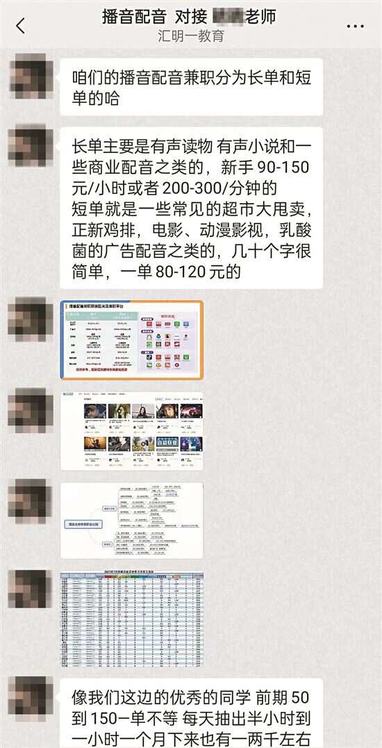 “这个课一开始有两三百人,后来就只有一二十人,每一次课学生都逐渐减少,感觉不对。”汪小姐告诉记者,报名课程后,前后对接了9位老师,都是通过直播线上授课。2023年8月30日她接到了第一份配音单,9月4日收到试音报酬15元后,其他配音单再没收到报酬,询问老师获回应“有钱的,只是还没下来”。一连几单都是这样,汪小姐意识到可能被骗。她查看合同时发现,第七条第二款中约定“若一方违反本协议的约定,应向守约方支付汇明教育5%的违约金和相应课时费。若违约金不足以弥补守约方因此而遭受的实际损失,违约方应对差额部分予以补足。”