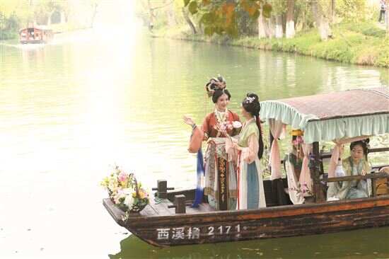 ■“花神”乘坐花船在西溪湿地巡游。新华社发