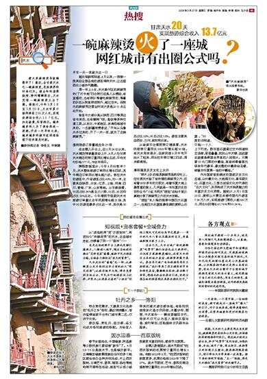 煮太多麻辣烫导致锅都坏了!最近,去甘肃天水吃一碗麻辣烫,是旅游界的时尚行为。继去年的淄博烧烤、柳州螺蛳粉后,天水凭借一碗麻辣烫火出了圈。据统计,今年3月1日至3月20日,天水市累计接待游客236万人次,实现旅游综合收入13.7亿元。如此场景,似曾相识。越来越多的人为了美食奔赴一座城,开启一次寻味之旅,越来越多的城市在网络助推下迎来高光时刻。