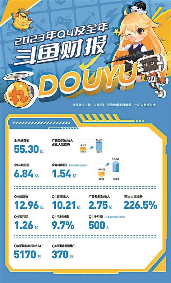 新快报讯 记者郑志辉报道 北京时间3月26日,斗鱼发布了2023年第四季度及全年未经审计的财务报告。财报显示,斗鱼第四季度总营收12.96亿元,直播收入10.21亿元,广告及其他收入2.75亿元,同比大幅提升226.5%;毛利润1.26亿元,毛利率为9.7%,调整后净亏损为500万元。本季度移动端平均MAU为5170万,环比保持稳定,季度付费用户为370万。