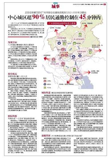 《规划》指出,到2035年,广州要建成全国重要综合交通枢纽,要将中心城区超过90%居民通勤时间控制在45分钟内。到本世纪中叶,在全球城市网络中发挥更广泛、更全面的引领和控制作用,打造高效率畅达的枢纽之城。