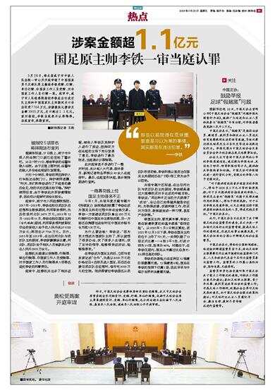 3月28日,湖北省咸宁市中级人民法院一审公开开庭审理了中国国家男子足球队原主教练李铁受贿、行贿、单位行贿、非国家工作人员受贿、对非国家工作人员行贿一案。庭审中,咸宁市人民检察院指控李铁在出任武汉队主帅和中国国家队主帅期间共计非法收受7764万元,涉嫌操纵比赛涉及金额3905万元,总计超过1.1亿元。面对指控,李铁当庭表示认罪悔罪。法庭宣布,择期宣判。