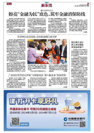 新快报讯 近年来,建行东莞市分行积极践行金融工作政治性、人民性,持续落实金融消费者权益保护教育宣传工作,切实保护金融消费者合法权益,不断擦亮“金融为民”的底色,被东莞市金融消费权益保护协会评为“金融知识宣传教育先进单位”。