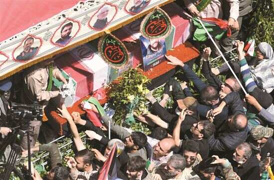 ■4月5日,在伊朗德黑兰,人们参加伊朗驻叙使馆遭袭事件中丧生的7名伊朗伊斯兰革命卫队成员的葬礼。新华社发