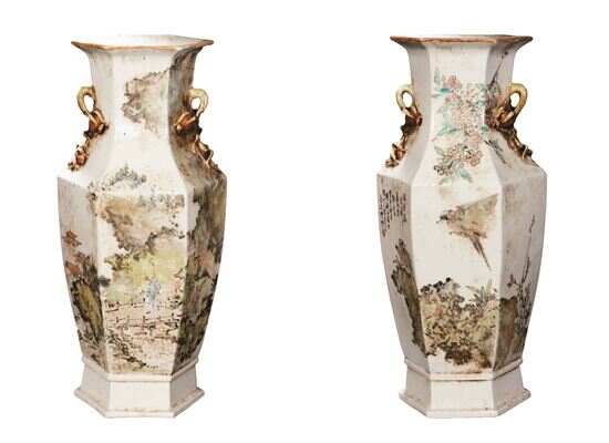 ■清光绪,金品卿,山水花鸟六棱双耳瓶(一对),高 46.5cm。