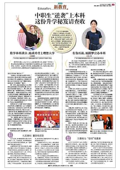 广东2024春季高考录取已于日前结束,今年多所中职学校考上本科的人数创历史新高,其中更有不少考生高分“上岸”。中职生如何“逆袭”上本科,他们有什么升学秘笈?新快报记者采访了来自广州市轻工职业学校和广州市旅游商务职业学校的两名高分考生,一起来听听她们的升学故事。