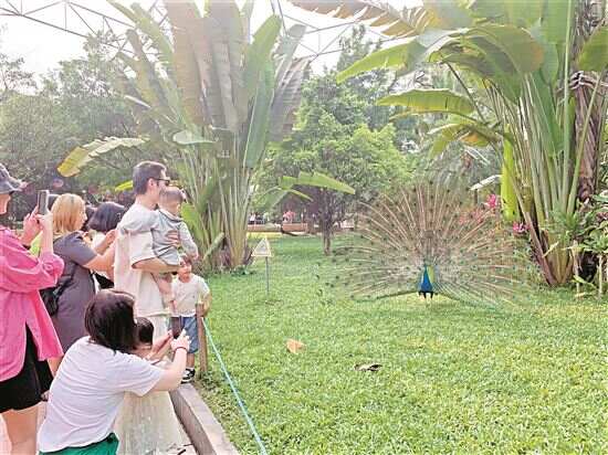 就在记者采访间隙,一名身穿黄色上衣、两三岁的小朋友突然跨过绳子,想追逐孔雀,一旁巡逻的保安马上制止。与此同时,其家人还在拍视频,表示“没事”。工作人员便向游客展开了劝告。