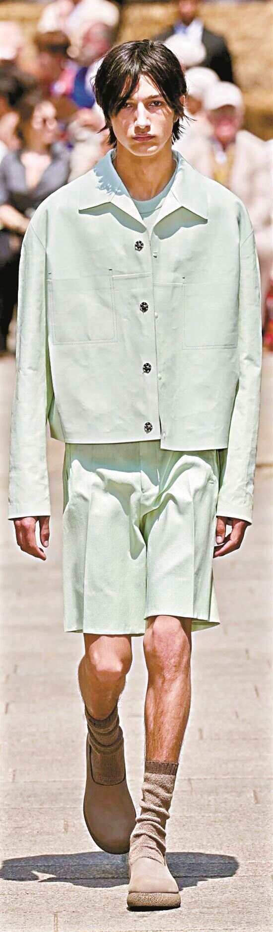 这波色彩风潮在男装系列中也不吝用成套薄荷绿的整体造型来诠释。