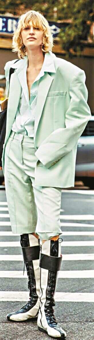 将薄荷曼波带进通勤穿搭里,绿色与西装衬衫的搭配,消解了乏味,让穿搭更显生机。