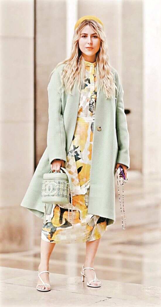 担心黄色会显得肤色黑黄的时髦精可用低饱和度的薄荷色调作为过渡色。