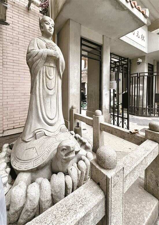 石像胸前的“大红花”点明了他的身份:状元——从唐代开始到科举制度废除,岭南地区历史上一共出过9名状元,状元坊这位,便是唯九的状元之一、咸淳七年(公元1271年)的状元张镇孙,“状元坊”正因此得名。