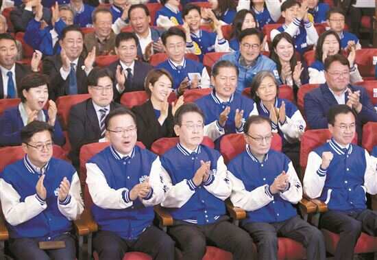 ■韩国最大在野党共同民主党党首李在明(前排中)与共同民主党领导层共同庆祝出口民调结果大幅领先。
