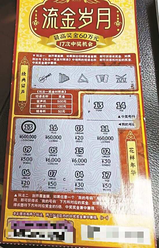 该票面值20元,共有17次中奖机会,最高奖金60万元。共有“经典留声”和“花样年华”两个玩法,玩法一:刮开覆盖膜,如果刮出任何奖金金额,即可获得该奖金;如果刮出与《玩法一奖金对照表》中相同的短语名称,即可获得所对应的奖金。玩法二:刮开覆盖膜,如果任意一个“我的号码”与任意一个“中奖号码”相同,即可获得该“我的号码”下方所对应的奖金;如果刮出“音符”图符,即可获得该图符下方所对应奖金的5倍。两个玩法区内的中奖奖金兼中兼得。