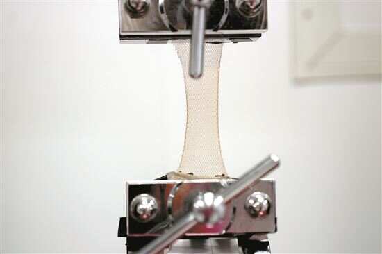 ■在东华大学纺织面料技术教育部重点实验室拍摄的金属网拉伸性能实验(4月2日摄)。