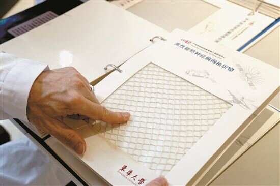 “这张金属网就是星载天线的关键部位,能反射电磁波进行信号传输。这是用每根直径不到头发丝四分之一的金属钼丝,三根并在一起编织而成。每根钼丝表面镀了金,能有效增强反射率;钼丝中还掺入了有机元素,使其更加强韧。”东华大学产业用纺织品教育部工程研究中心主任陈南梁教授介绍说。