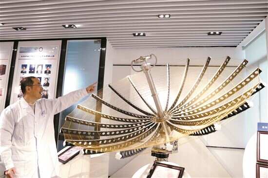 这把“金色大伞”由东华大学产业用纺织品教育部工程研究中心研制。在该校实验室,记者见到了这把“金色大伞”的缩比模型,只见一根根圆弧状的“伞骨”支撑起一层薄如蝉翼的金黄色网状“伞面”。