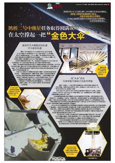 鹊桥二号通过一个大型可展开的星载天线,实现月球背面与地球之间的信号传输。星载天线完全展开后,形如一把直径达4.2米的“金色大伞”。在广袤无际的茫茫太空,既硬核又浪漫!