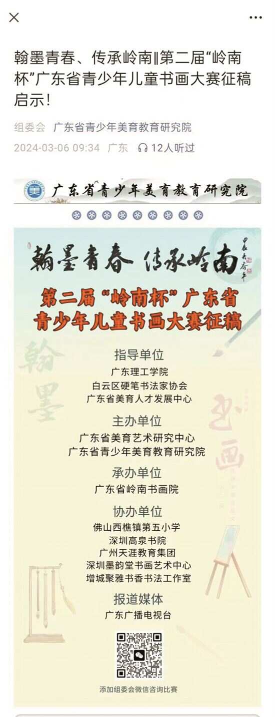 ■广东省首届“岭南杯”青少年儿童书画大赛的推文使用了“翰墨青春、传承岭南”的主题。