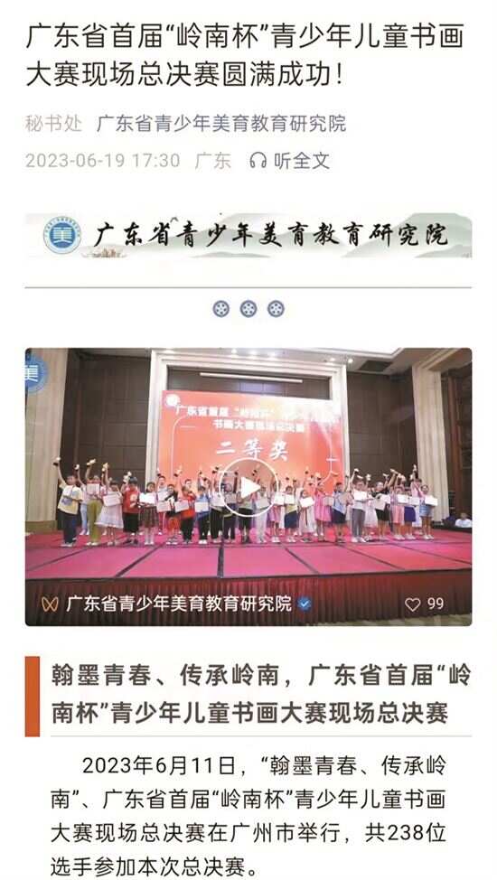 根据家长反馈的线索,记者找到发布征稿启事的公众号——广东省青少年美育教育研究院。该院是第二届“岭南杯”广东省青少年儿童书画大赛主办方之一,其公众号、网站上发布了多条比赛的推文。
