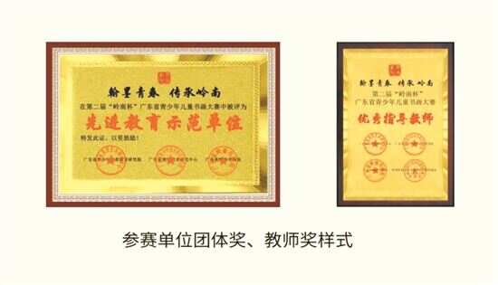 此外,记者查询发现,广东省首届“岭南杯”青少年儿童书画大赛现场总决赛已于2023年6月11日举办。其公众号推文和官方网站上的图片和文字上均有“翰墨青春 传承岭南”的字眼。今年3月6日,该公众号发布第二届比赛征稿启事,再次使用了“翰墨青春 传承岭南”的主题。此外,文中的初赛学生获奖证书、奖牌样式,初赛单位团体奖、教师奖样式,现场总决赛学生获奖证书、奖杯、奖牌样式中均使用了该主题,并在显著位置呈现。