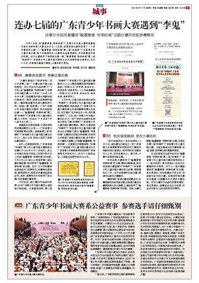 广东青少年书画大赛是由广东省教育厅指导,广东新快报社、广东省美术家协会、广东省书法家协会共同主办的全国性高规格青少年艺术赛事。大赛自2015年正式启动以来,至今已成功举办七届,是一项普及性、持续性的公益赛事,累计征集来自全国各省市自治区及港澳台的书画作品近二十万件,2018年大赛被广东省委宣传部列入重点文化扶持项目名录。作为广东省书法家协会唯一指定并参与的青少年书画比赛,大赛的来稿范围已覆盖全国所有省市自治区及港澳台地区,成为华南地区规模最大、最具影响力的青少年艺术赛事。