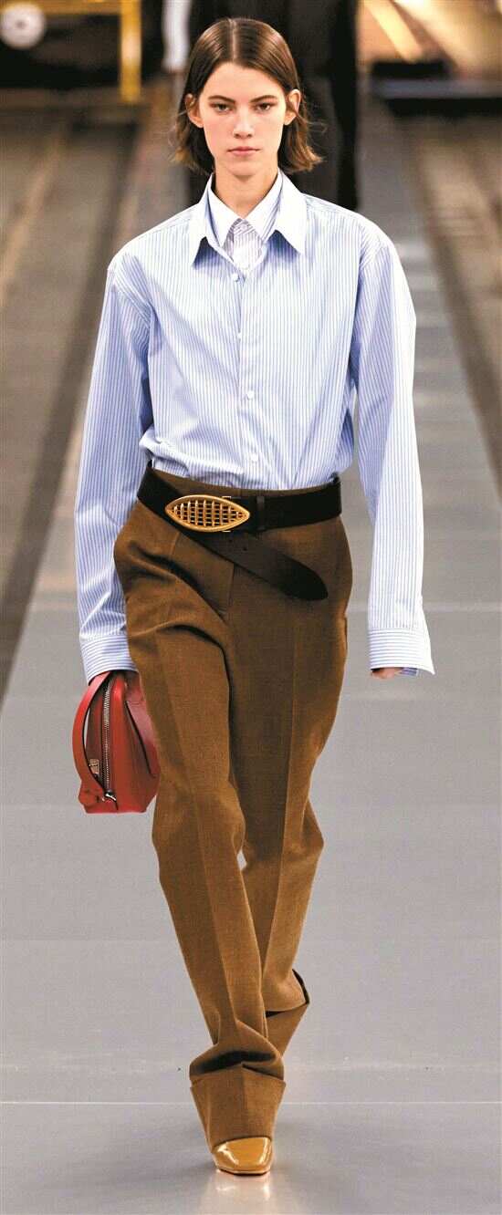 Tod’s 2024秋冬高级成衣系列 用大廓形金属饰扣腰带为职场元素单品注入果决利落之感。