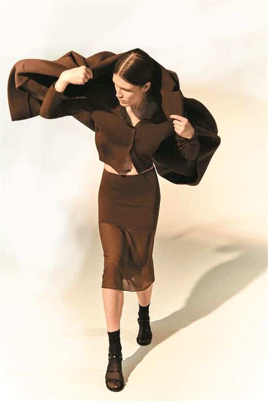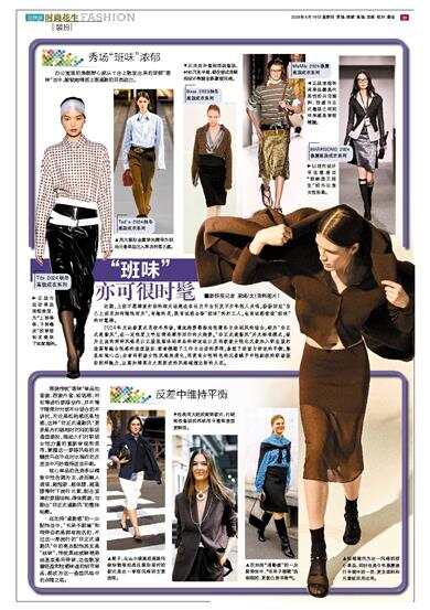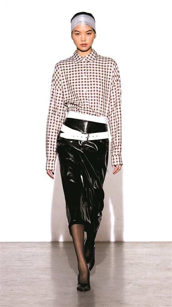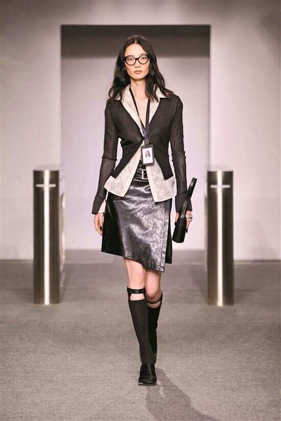 核心单品的色彩多以精致中性色调为主,进而融入透视、超短款、超低腰、超高腰等时下流行元素,配合紧凑的穿搭结构、得体剪裁,勾勒出“非正式通勤风”的整体轮廓。
