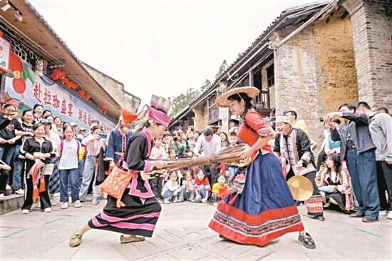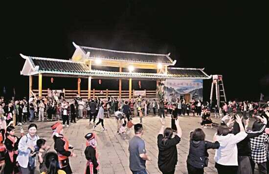 在古占瑶寨,游客与瑶族群众共跳团圆舞。