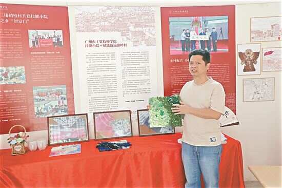■驻三排镇工作队队员兼油岭村第一书记赖家木介绍广州市工贸技师学院创作的助力乡村振兴创意作品。