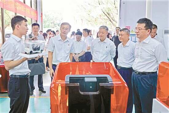 ■广州市技师学院党委书记李明根(前排左二)等参观世界技能大赛原型制作项目南沙人才培育基地。通讯员供图