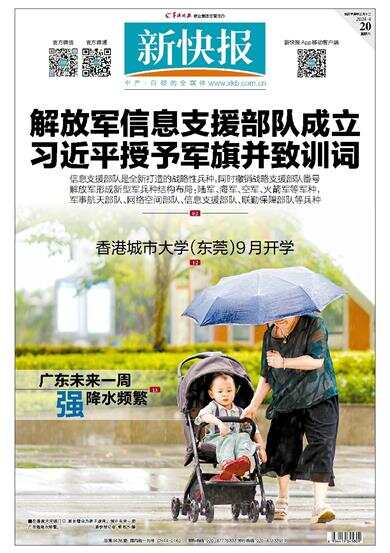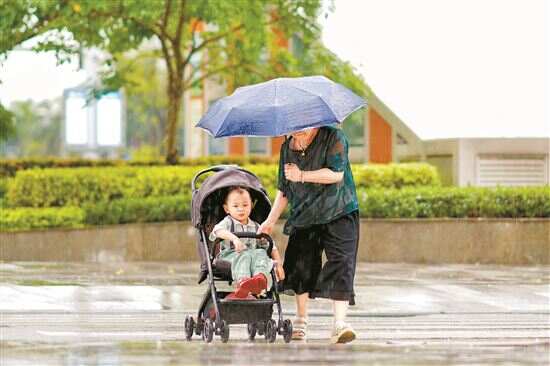 ■在番禺天河城门口,家长撑伞为孩子遮雨。预计未来一周广东强降水频繁。新快报记者 郭思杰/摄