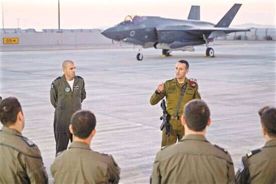 ■近日,以色列国防军总参谋长哈莱维(后右)在以色列内瓦提姆空军基地讲话时表示,伊朗对以色列发动的导弹和无人机袭击“史无前例”,将“遭到回应”。新华社发