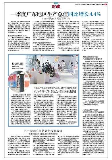 新快报讯 记者许婉婕 通讯员魏胜广 何婉虹报道 4月24日,广东省统计局公布了2024年第一季度广东经济运行情况。根据地区生产总值统一核算结果,一季度广东实现地区生产总值31510.66亿元,同比增长4.4%,增速比上年同期提高0.4个百分点。