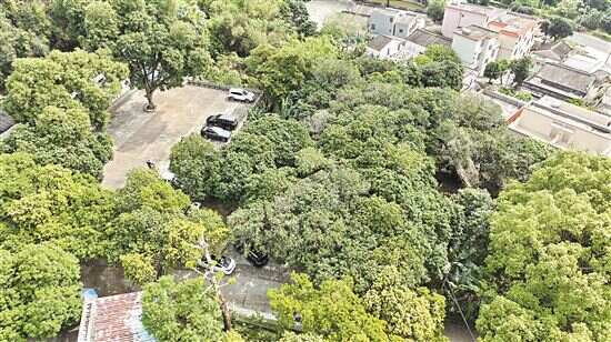 从空中俯瞰,古树群隐于槟榔山村的村居之后,与五桂山的林海连成一片,仿佛戍边的卫士,驻扎于此。