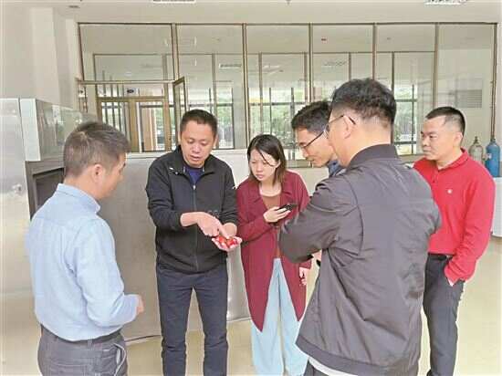■曹盛华(左二)讲解圣女果的品质分类。
